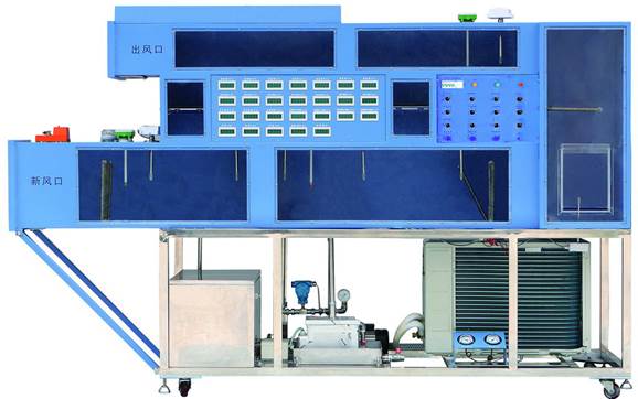 空調製冷換熱係統由實驗台、製冷機組、製(zhì)熱係統、加濕裝置、空調箱(風道)、冷凍水係統(tǒng)、測量儀表(包括溫濕度傳感(gǎn)器及風速傳感器)、電氣控製係統、模擬熱源等組成。